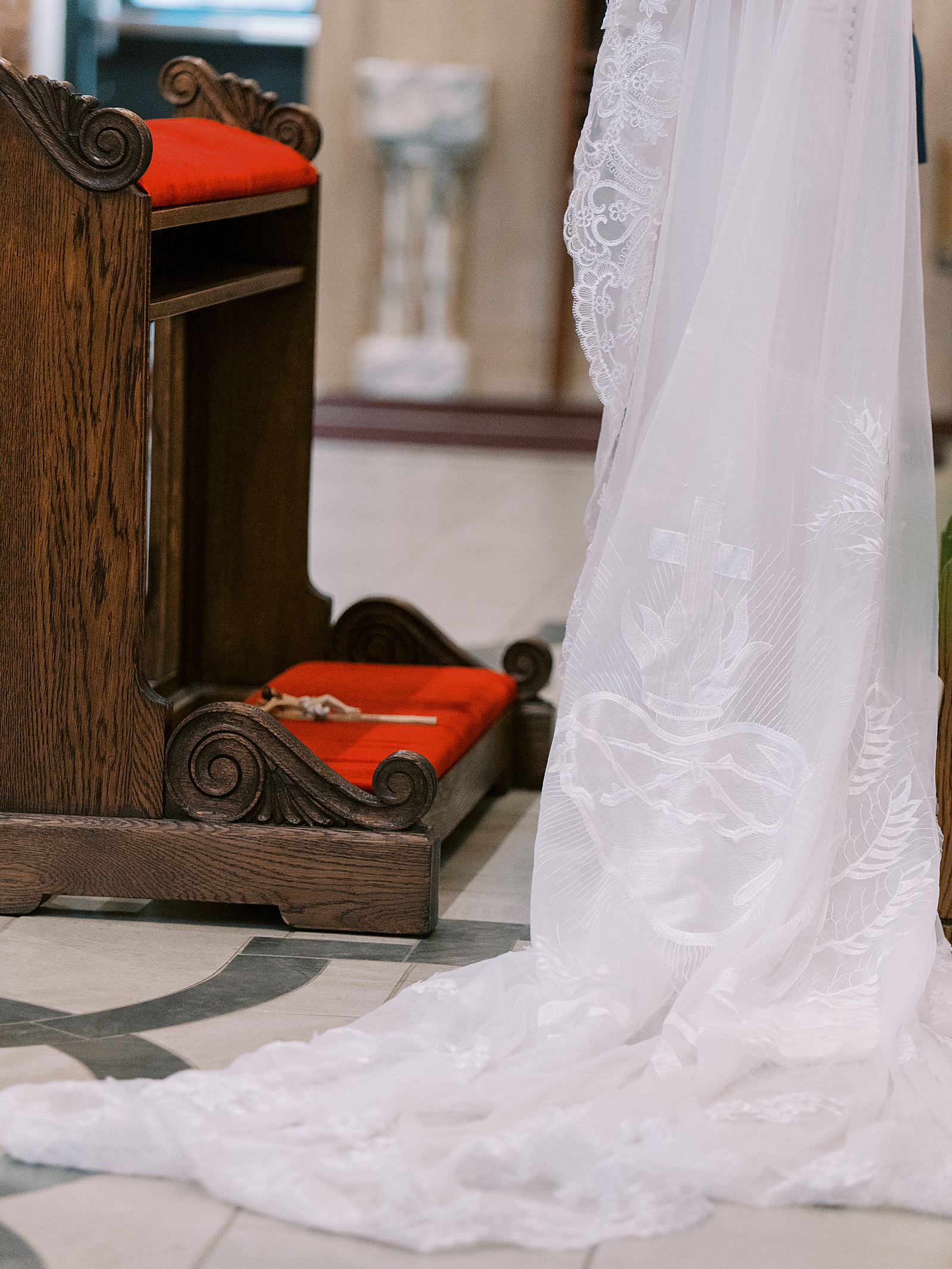 From the very beginning, Brooke and Eben made it clear to me that their wedding would be soley centered around Christ. They wanted to show the beauty of The Catholic Faith to their family and friends in attendance, even down to the smallest of details. From details like their Marian crest wax seals on their invitations and Eben’s Sacred Heart cufflinks, choosing a Traditional Latin Mass wasn’t just a stylistic decision, it was a reflection of how deeply they love The Catholic Faith. One of my favorite details of the day was Brooke’s custom, Sacred Heart of Jesus veil! As a couple, Brooke and Eben share a great devotion to The Sacred Heart and she found the most breathtaking way to incporate it into her classic bridal look. It stunned everyone and she had so many compliments!